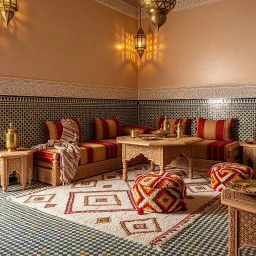 Tadelakt authentique Zellige fait main Fer forgé local Bois de thuya sculpté Tissages berbères.